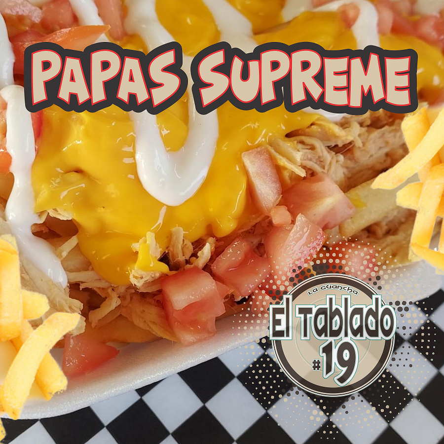 Ricas papas fritas envueltas en pollo, queso y tomate fresco.